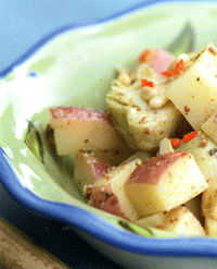 1 lb red-skinned potatoes, unpeeled, scrubbed and cut into 1-inch pieces Sea salt 1/4 cup extra-virgin olive oil 1 Tbsp Dijon mustard 1 small red jalapeno, seeded and finely chopped 1/8 tsp cayenne pepper 1 Tbsp white wine vinegar 3 Tbsp chopped fresh mint One 14-oz can artichoke hearts, drained and halved Freshly ground black pepper 1/4 cup pine nuts Serves 2